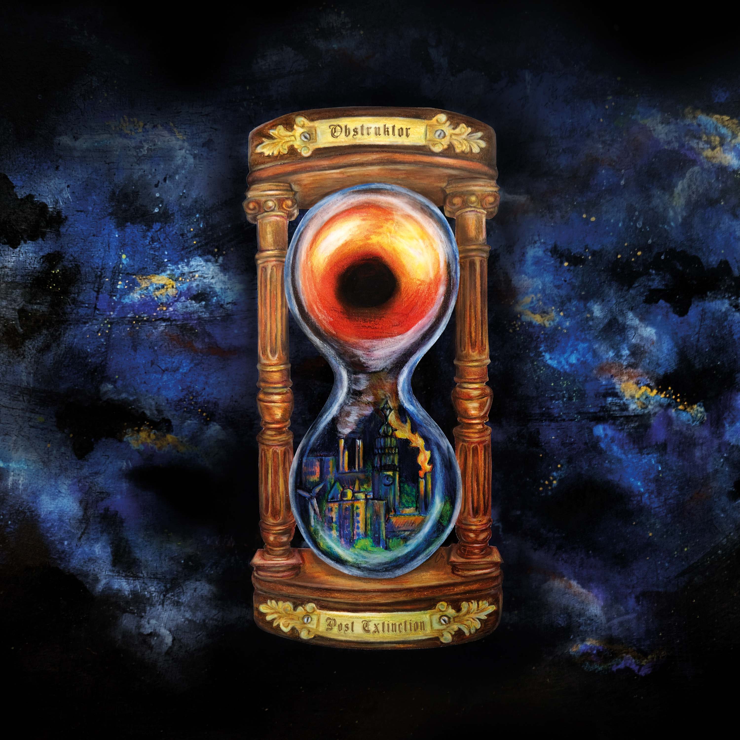 Thanks! The cover art is an hourglass with a depiction of an overgrown city (representing society as a whole) in the bottom still polluting the skies, implying that even though we are clearly working ourselves to ruin, humanity will not care nor listen. The top half holds the black hole at the centre of our universe in which we’re bound to disappear, regardless of our actions. The city in the bottom is sucked into the black hole, rather than sand falling down from top to bottom, implying that time has run out and we are completely defenseless against the forces of nature and time itself. Valuable details are that the artwork was based on skylines and details from our direct surroundings from where we live. The city for instance consists of important landmarks and industrial scenery in and around our hometown of Haarlem and the frame of the hourglass was inspired by an old cabinet we have in the kitchen of our studio. The artwork was made by Elisa of Wild Black Cherry (@wild.black.cherry on Instagram).